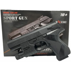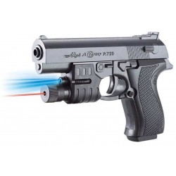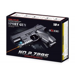 Komplekte: pistoletas, dėtuvė, lazerinis taikiklis + mėlynas žibintuvėlis.