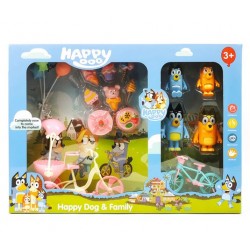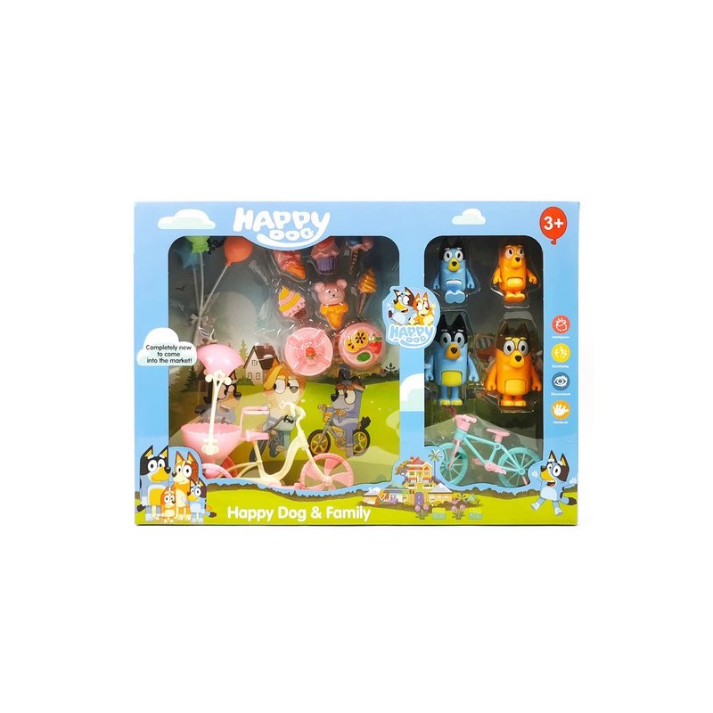- 4 figūrėlės, vaizduojančios skirtingus dydžių šunyčius, 2 skirtingo dydžio dviračius + 9 priedai