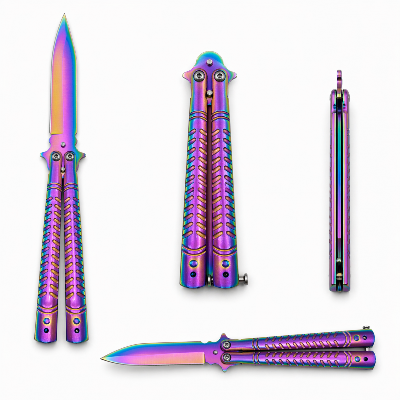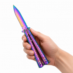 Svajojate apie peilį, kuris ne tik atitiktų visus funkcinius reikalavimus, bet ir išsiskirtų neįprastu dizainu? Jei taip, tuomet šis aštrus aštrus Butterfly tipo peilis "rainbow fade" yra būtent tai, ko jums reikia.