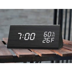 Modernus ir stilingas laikrodis su medžio imitacijos apdaila gražiai atrodys tiek miegamajame, tiek svetainėje ar biure. Daugiafunkcinis ekranas rodo datą, laiką, temperatūrą, drėgmę. Jame yra balti šviesos diodai, kurie aiškiai ir maloniai šviečia. Elegantiškas dizainas puikiai atrodo bet kokiame interjere.