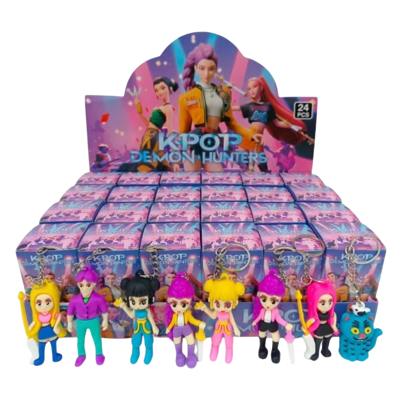Pakuotė - staigmena. Joje slepiasi viena iš K-pop Demon Hunters veikėjų (raktų pakabukas).