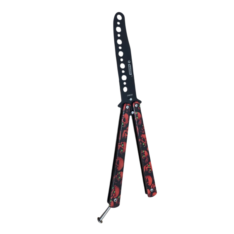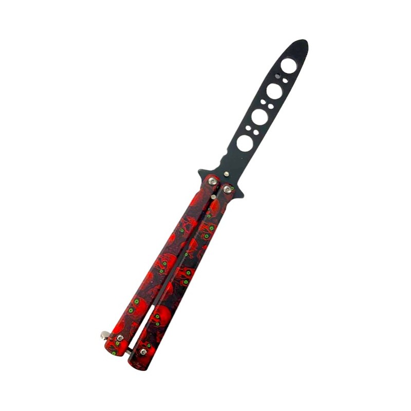 Saugus sulankstomas peteliškės tipo treniruočių peilis leis treniruotis nebijant susižeisti. Puikus pasiūlymas pradedantiesiems. Suapvalinti peilio ašmenys yra visiškai buki ir be aštrių briaunų. Peilis puikiai telpa rankoje ir yra gerai subalansuotas, o tai neabejotinai pagerina naudojimo patogumą. Pagamintas iš kokybiško metalo, kuris yra atsparus rūdims ir neslysta rankoje. Peilio geležtė turi skyles, kurios sumažina oro pasipriešinimą ir padidina sukimo rankoje greitį. Tai labai stilingas ryškių spalvų treniruočių peilis.