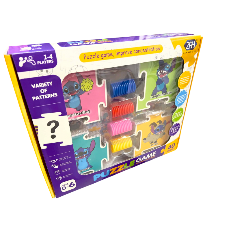 Tai „Stitch“ tematikos paveikslėlių derinimo dėlionės žaidimas, skirtas vaikams nuo 0 iki 6 metų. Tai lavinamasis žaislas, padedantis ugdyti dėmesio koncentraciją, rankų ir akių koordinaciją bei vaiko gebėjimą atpažinti formas ir raštus.