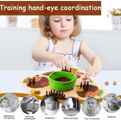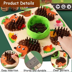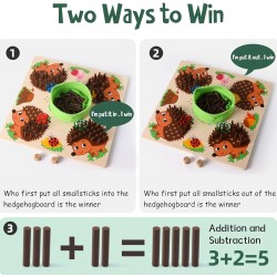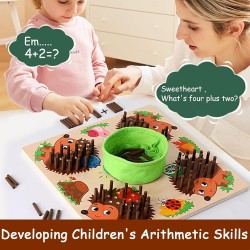 Mokomajame ežiuko žaidime, skirtame mokytis skaičiuoti, yra medinė lenta, pagaliukai su matematinėmis lygtimis ir specialūs kauliukai, leidžiantys interaktyviai žaisti. Spalvingos lazdelės patraukia dėmesį ir padeda lengviau išmokti skaičiuoti, sudėti ir atimti. Vaikai gali žaisti žaidimą vieni arba grupėje, o tai padeda lavinti socialinius ir bendravimo įgūdžius.