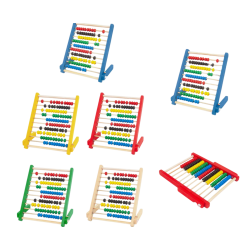 Spalvoti, mediniai pastatomi skaitliukai. 5 spalvų karoliukai. Iš viso 100 karoliukų: 10 eilučių po 10 karoliukų.