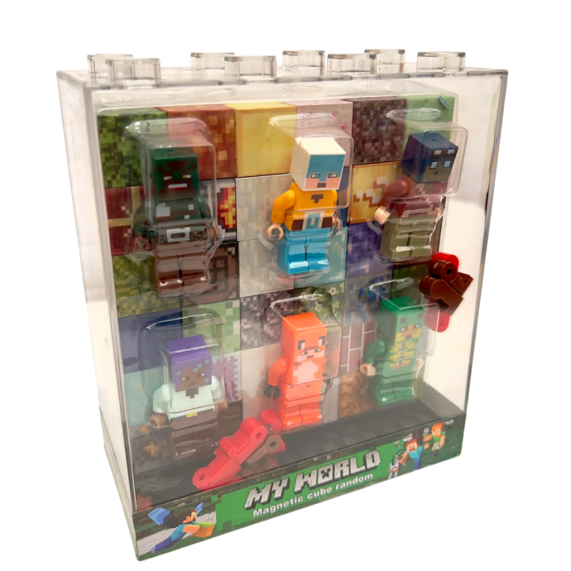 Populiaraus kompiuterinio žaidimo Minecraft veikėjų ir magnetinių blokelių rinkinys. Rinkinį sudaro 6 Minecraft žmogeliukai ir jiems priklausantys ginklai bei 72vnt. magnetinių kubelių. Nauji, įkvepiantys personažai įneš gaivaus oro į jūsų LEGO detalių pasaulį ir padės kurti naujas istorijas bei scenas iš mėgstamų filmų.