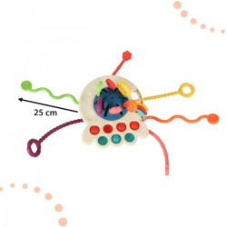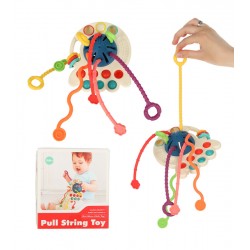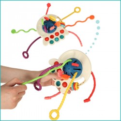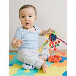Su žaislu galima sąveikauti net keturiais būdais: judinti spalvotus lankus, traukti silikonines virveles, spausti kamuoliuką tarp skylučių ir spausti kamuoliukus. Silikoninės virvelės ne tik skirtingų spalvų, bet ir įvairių tekstūrų. Žaidžiant su jomis reikia jas traukti iš vienos pusės į kitą. Užduotis atrodo paprasta, tačiau mažyliui tai gali būti nemenkas iššūkis! Spalvotos virvelės taip pat puikiai tinka kaip kramtukas! Šis žaislas puikiai atitinka Montessori pedagogiką, kuri teigia, kad būtent paprasčiausi žaislai, nors ir pernelyg funkcionalūs, duoda daugiausia naudos vaiko vystymuisi. Žaisdamas vaikas išmoks daug naudingų įgūdžių.