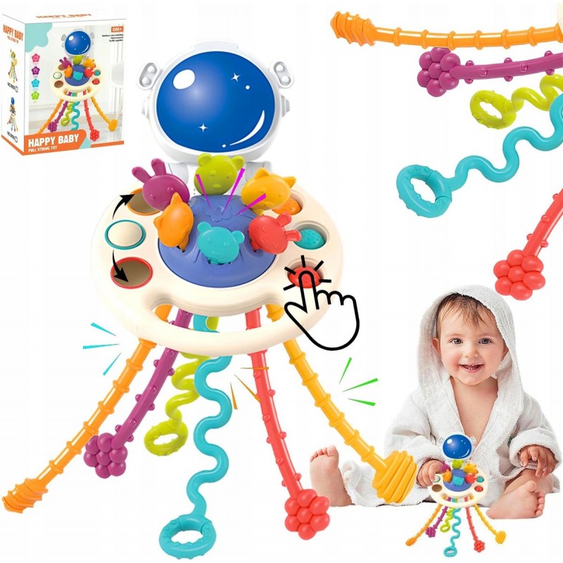 Su žaislu galima sąveikauti net keturiais būdais: judinti spalvotus lankus, traukti silikonines virveles, spausti kamuoliuką tarp skylučių ir spausti kamuoliukus. Silikoninės virvelės ne tik skirtingų spalvų, bet ir įvairių tekstūrų. Žaidžiant su jomis reikia jas traukti iš vienos pusės į kitą. Užduotis atrodo paprasta, tačiau mažyliui tai gali būti nemenkas iššūkis! Spalvotos virvelės taip pat puikiai tinka kaip kramtukas! Šis žaislas puikiai atitinka Montessori pedagogiką, kuri teigia, kad būtent paprasčiausi žaislai, nors ir pernelyg funkcionalūs, duoda daugiausia naudos vaiko vystymuisi. Žaisdamas vaikas išmoks daug naudingų įgūdžių.