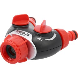 Sodo žarnos trišakis su vožtuvu, skirtas prijungti dvi žarnas prie 3/4 colio ir 1 colio čiaupo.