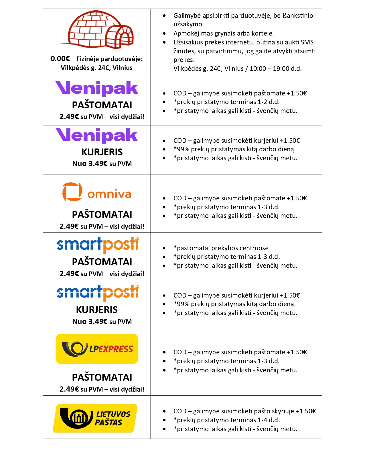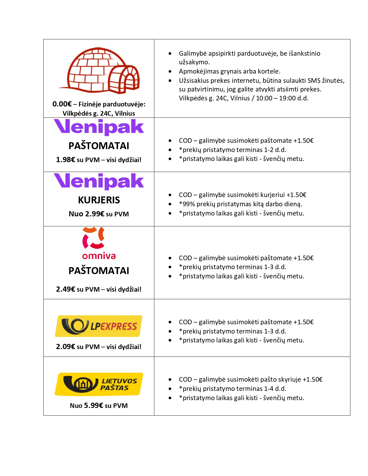 - Pristatymo taisyklės: pirkėjas susimoka nurodytą kainą už prekių pristatymą, tačiau neatsiimant siuntos dėl pirkėjo kaltės (iš kurjerio, paštomato, dėl klaidingai nurodytų rekvizitų, bei kitu atvėju) pirkėjas praranda sumokėtą siuntimo kainą ir apmoka pakartotino siuntimo įkainį.