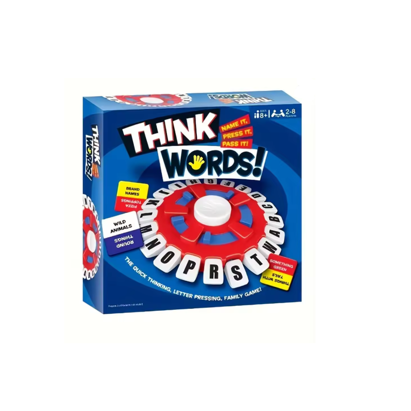 Stalo žaidimas THINK WORDS – tai Tapple principo, greito mąstymo ir reakcijos žaidimas, skirtas visai šeimai bei draugų kompanijoms. Šis žaidimas lavina kūrybiškumą, asociatyvų mąstymą ir gebėjimą greitai reaguoti, todėl puikiai tinka vakarėliams, kelionėms ar smagiam laisvalaikiui. TAPPLE žaidimo tikslas – per trumpą laiką sugalvoti žodį, prasidedantį konkrečia raide, atitinkantį duotą temą, kol laikmatis dar tiksi.