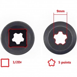 Specializuota galvutė akumuliatoriaus dangčio varžtams atsukti, speciali 5 kampų galvutė.
