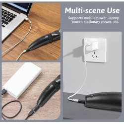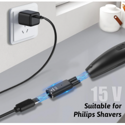 C tipo įkrovimo keitiklis: šis 15 V C tipo adapteris leidžia įkrauti „Philips Norelco OneBlade“ skustuvą, konvertuojant bet kurį USB-C maitinimo šaltinį į suderinamą įkrovimo įvestį. Tai daro jį universaliu priedu, kuriam reikia mažiau kelių įkrovimo laidų.