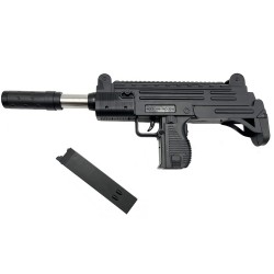 Airsoft ginklas pasižymi ilga dėtuve į kurią telpa daugiau kulkų nei į įprastus spyruoklinius pistoletus.