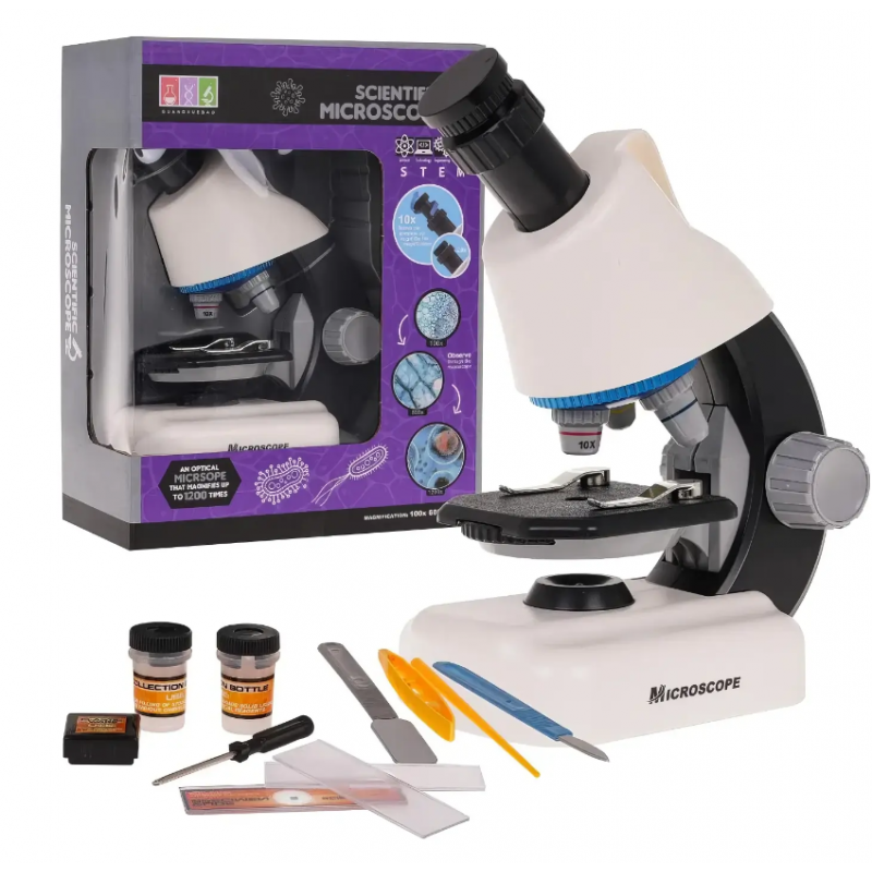 Mokomasis mikroskopo rinkinys skatina mokslinius tyrinėjimus ir atradimus, įdomiai pristato vieną svarbiausių mokslinių įrankių. Objektyvas suteikia galimybę reguliuoti padidinimą, su šiuo mikroskopų galima apžiūrinėti įvairius daiktus juos padidinus 100, 400 ir 1200 kartų. Mikroskopas turi pasukamą galvutę ir dvigubą šviesos šaltinį (viršutinį ir apatinį LED šviesos šaltinį), todėl galima stebėti tiek skaidrius, tiek neskaidrius mėginius.