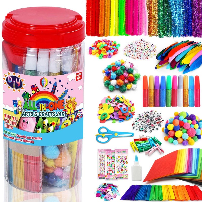 Atskleiskite vaikų kūrybiškumą su „All in One“ rankdarbių rinkiniu! Šiame spalvingame kūrybos stiklainyje rasite daugiau nei 100 įvairių detalių: spalvotą popierių, pom-pomus, akeles, formas iš putplasčio, blizgučius, lipdukus, lazdelės, sagas ir saugias žirkles.